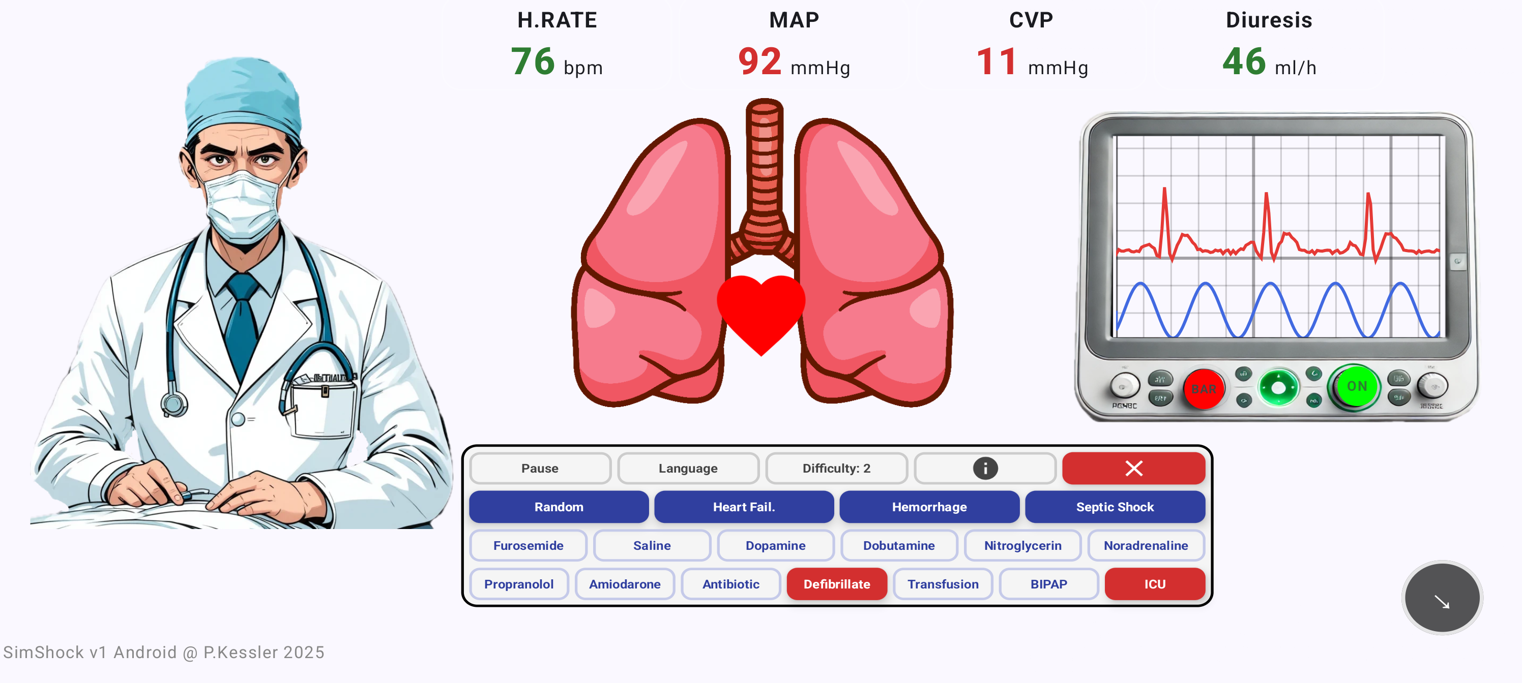El jugador puede iniciar la simulación haciendo clic en los botones de Insuficiencia Cardíaca , Hemorragia o Choque Distributivo . Luego, usando los botones terapéuticos, el objetivo es estabilizar y curar al paciente.